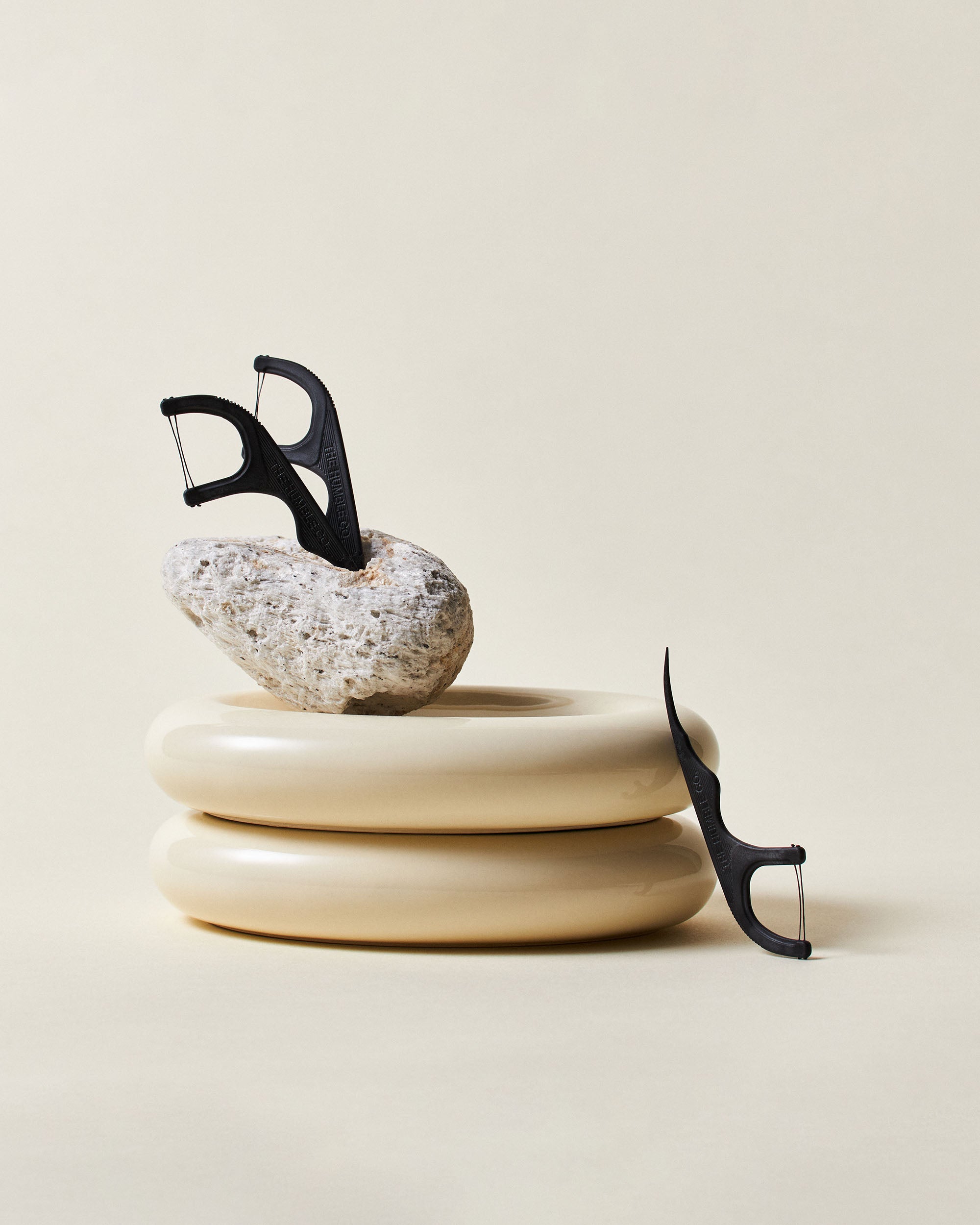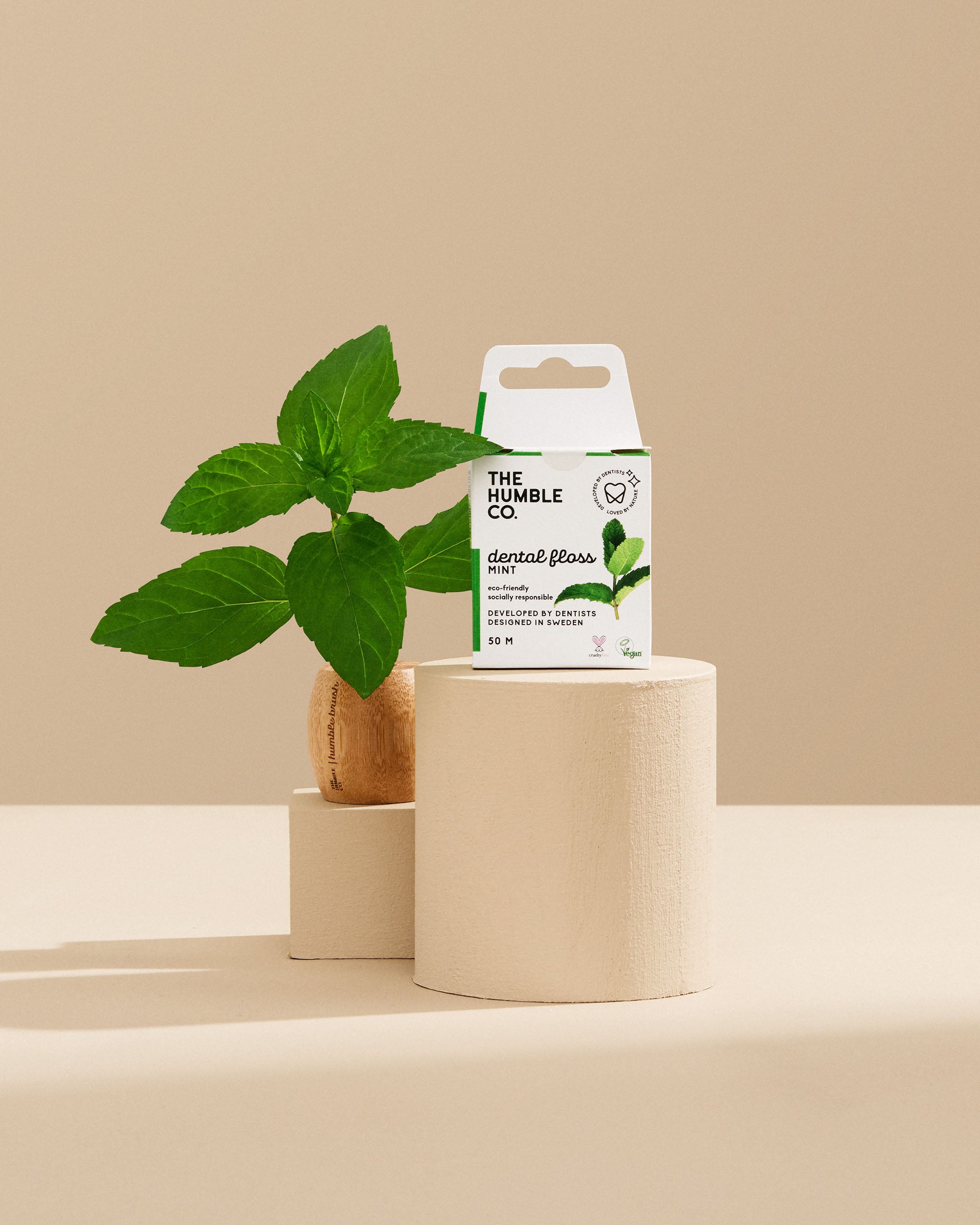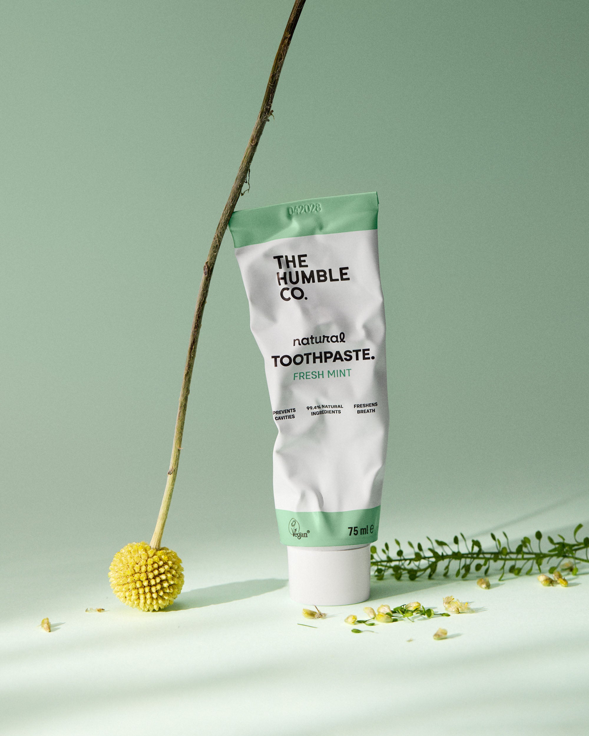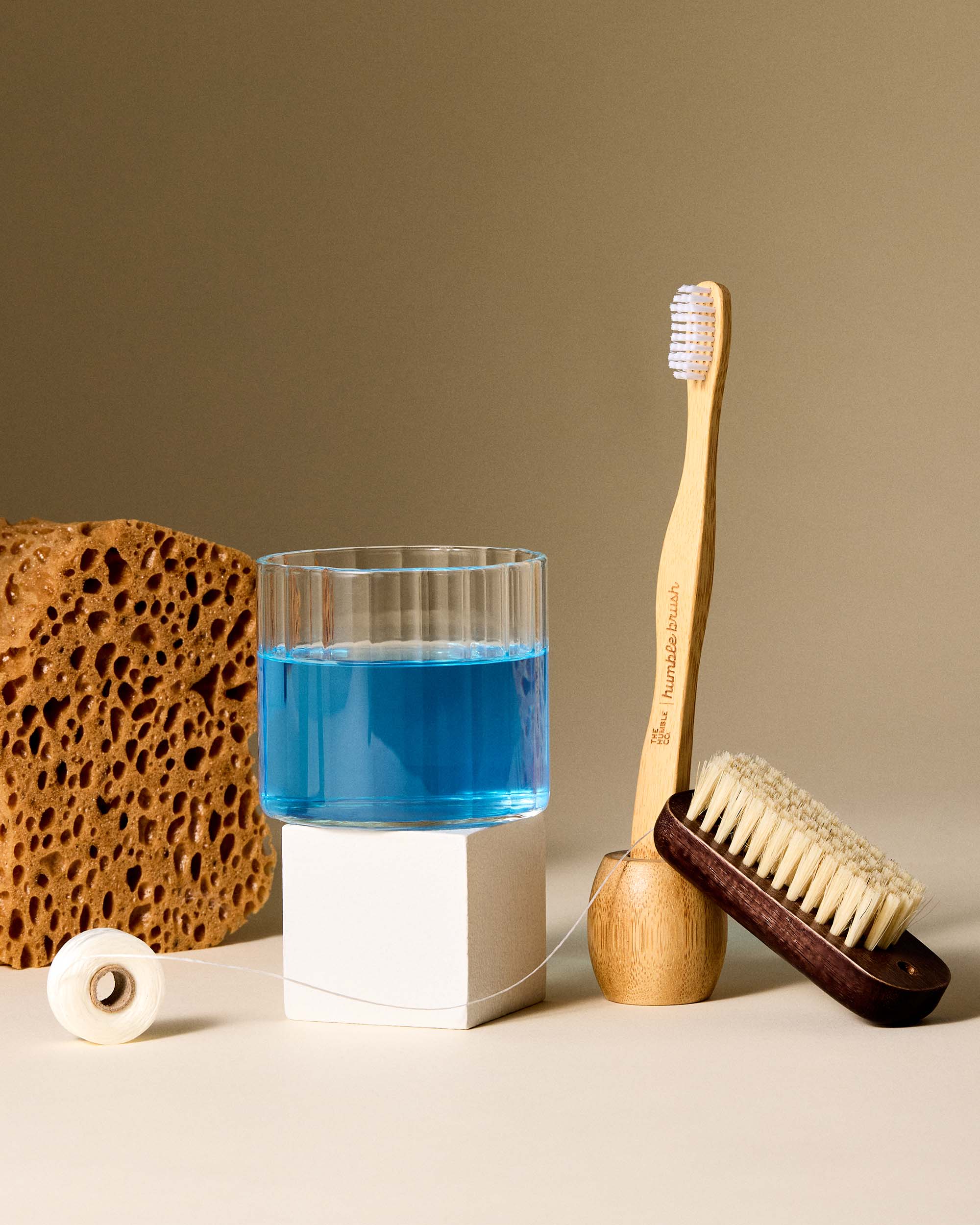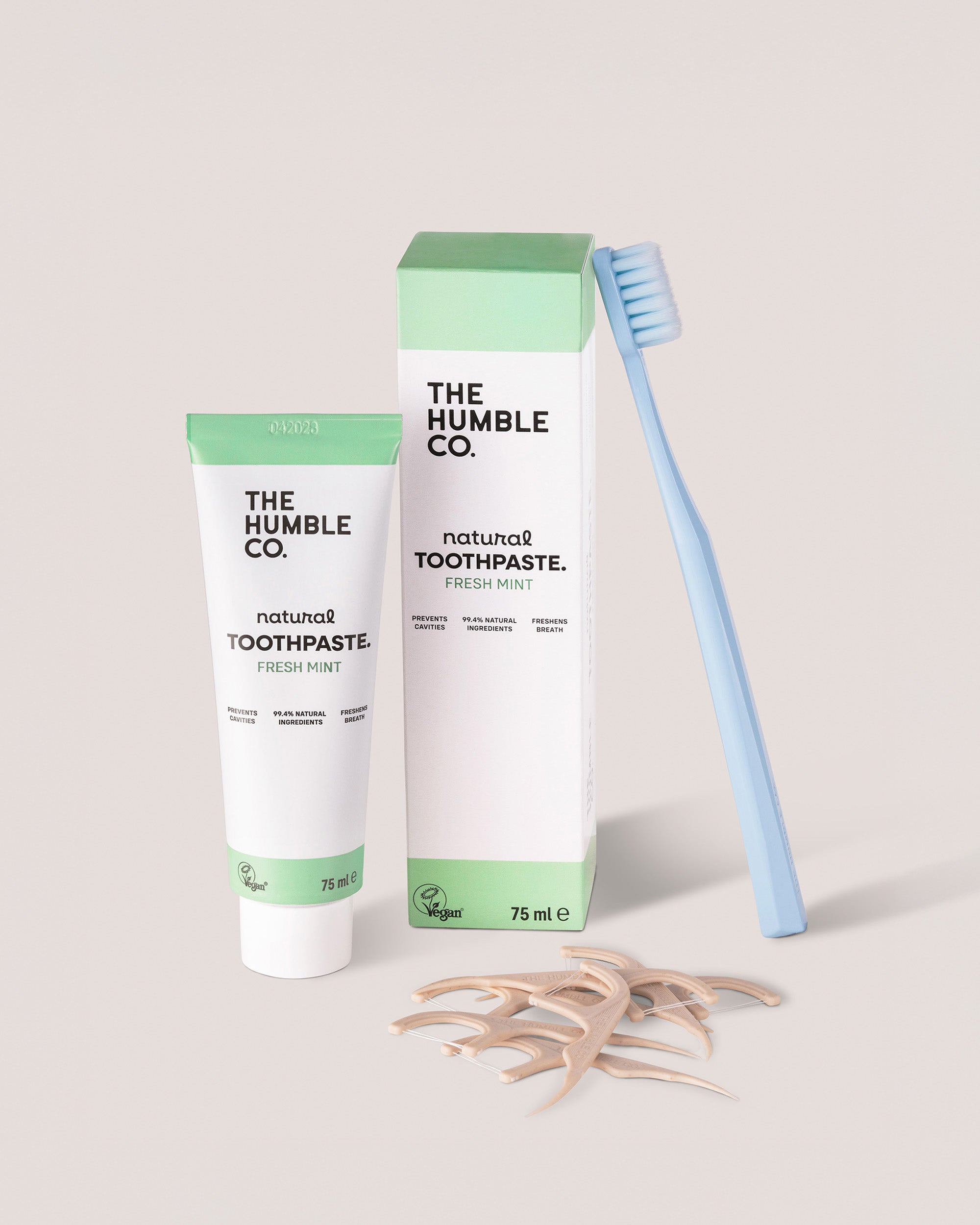 The Humble Co. dental care products including toothpaste, box, toothbrush, and floss picks on a light background