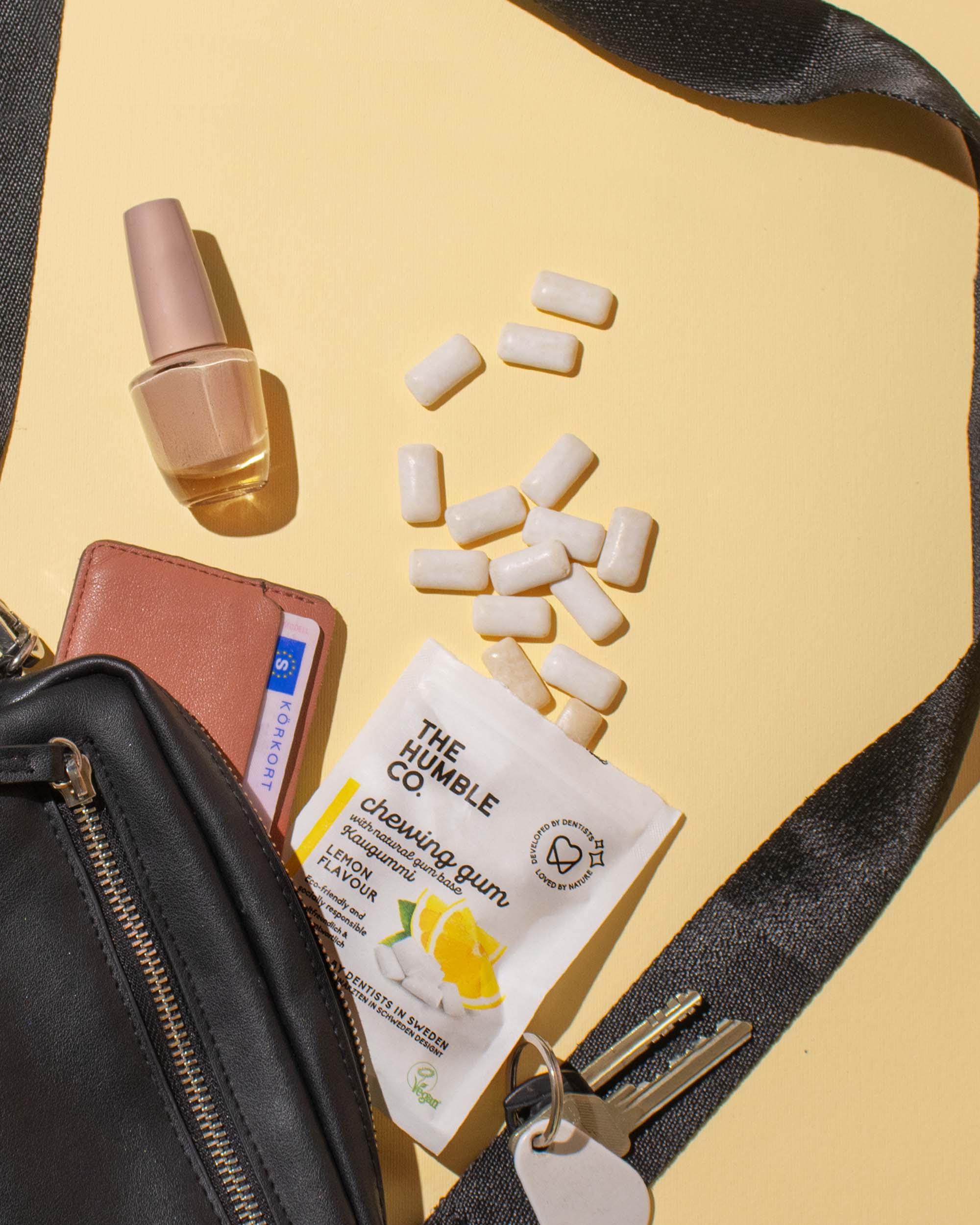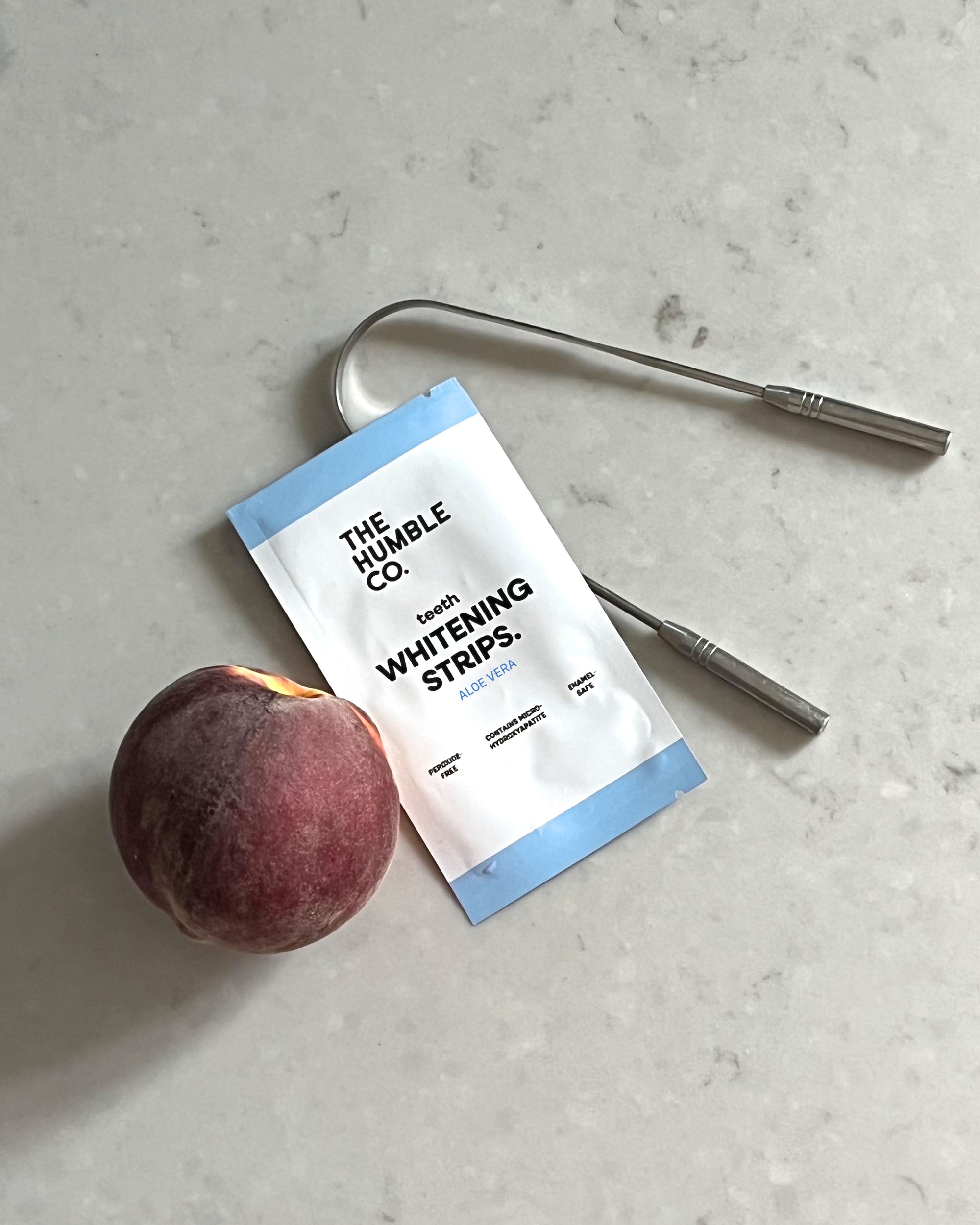 The Humble Co. dental care products including toothpaste, toothbrush, and whitening strips on a light background.